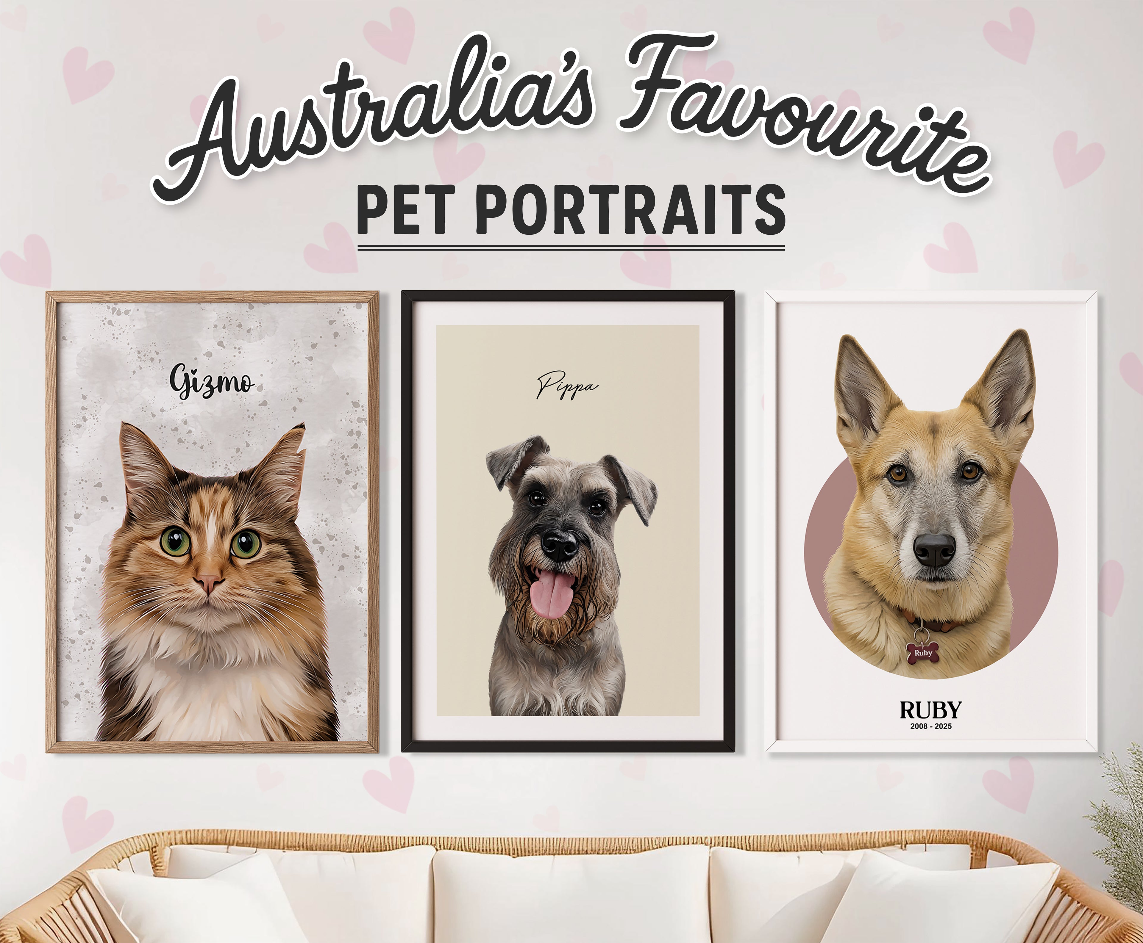 1. Choose your style, size, and frame colour, then upload your pet photo(s).