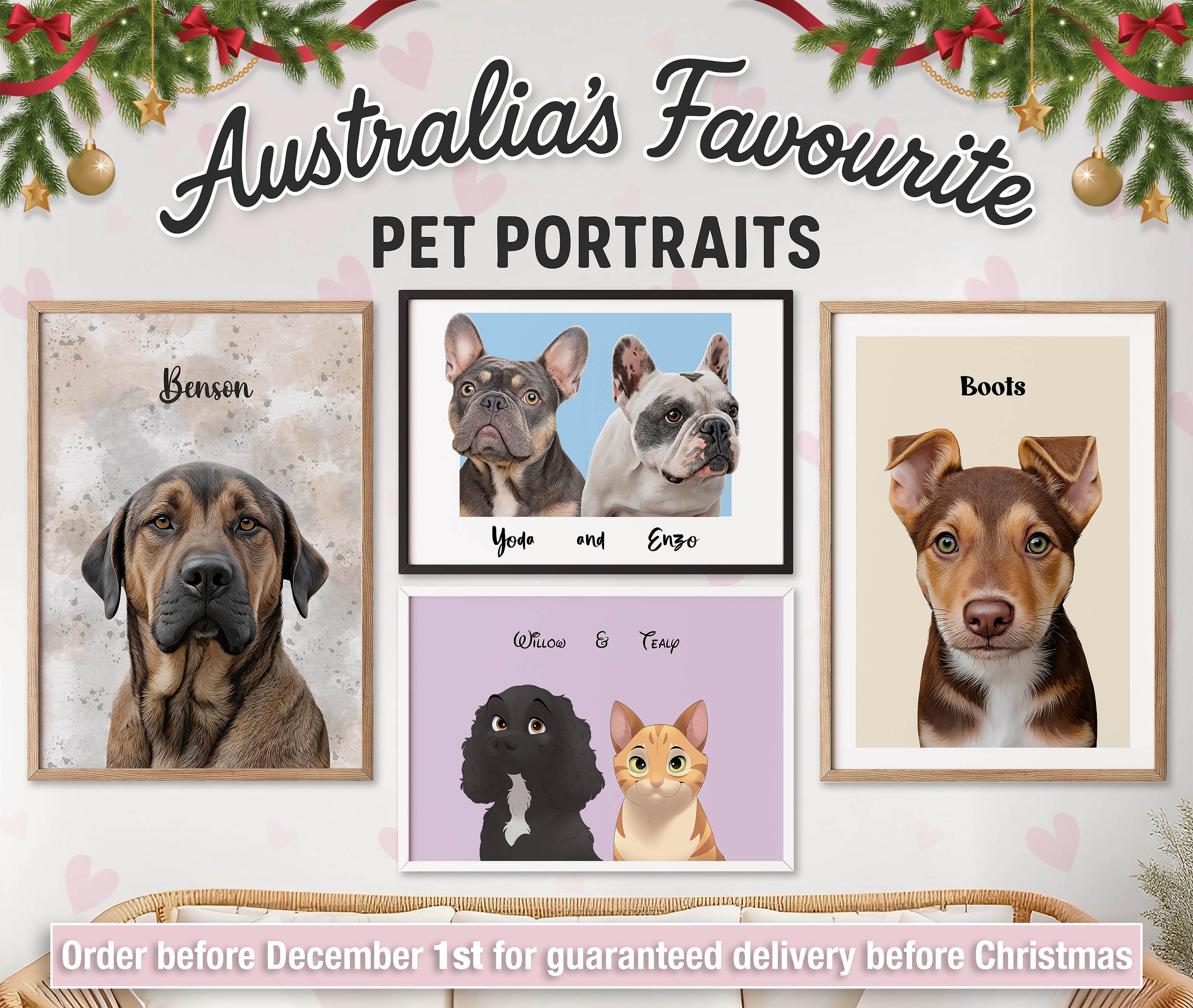 1. Choose your style, size, and frame colour, then upload your pet photo(s).