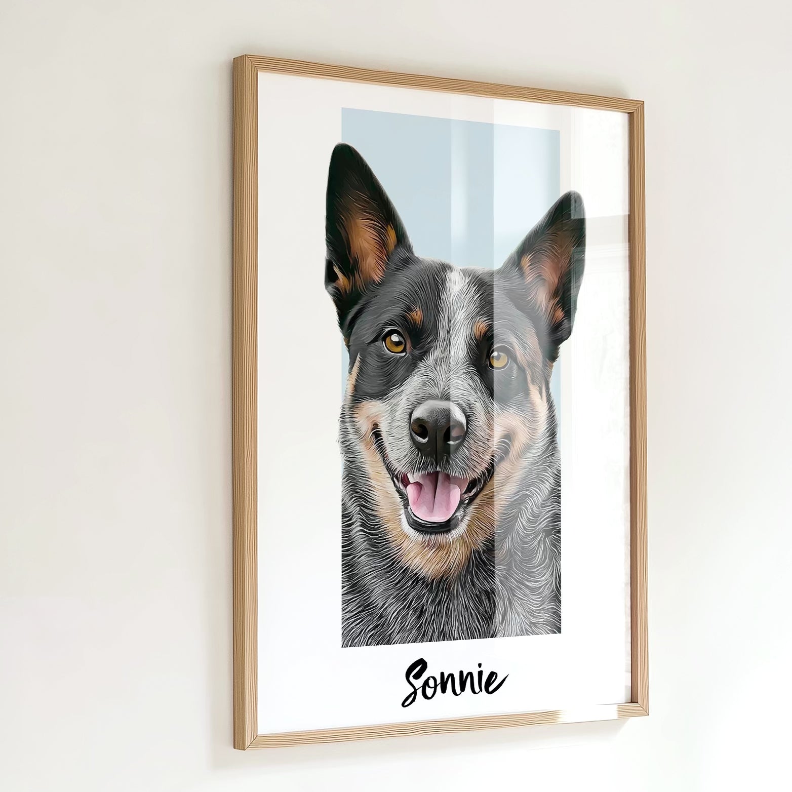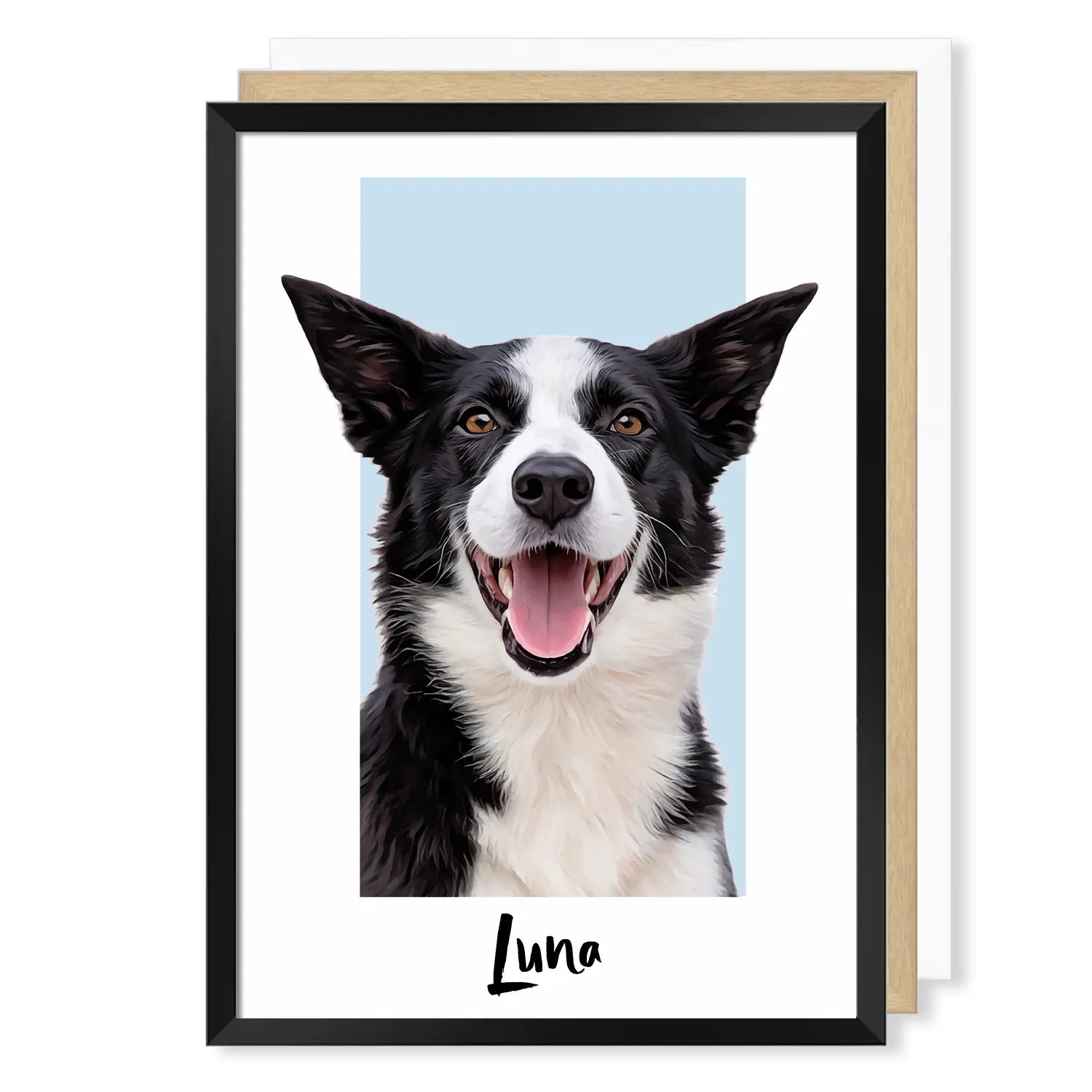 - A professionally printed and framed artwork of your pet, based on the photo/s you upload.