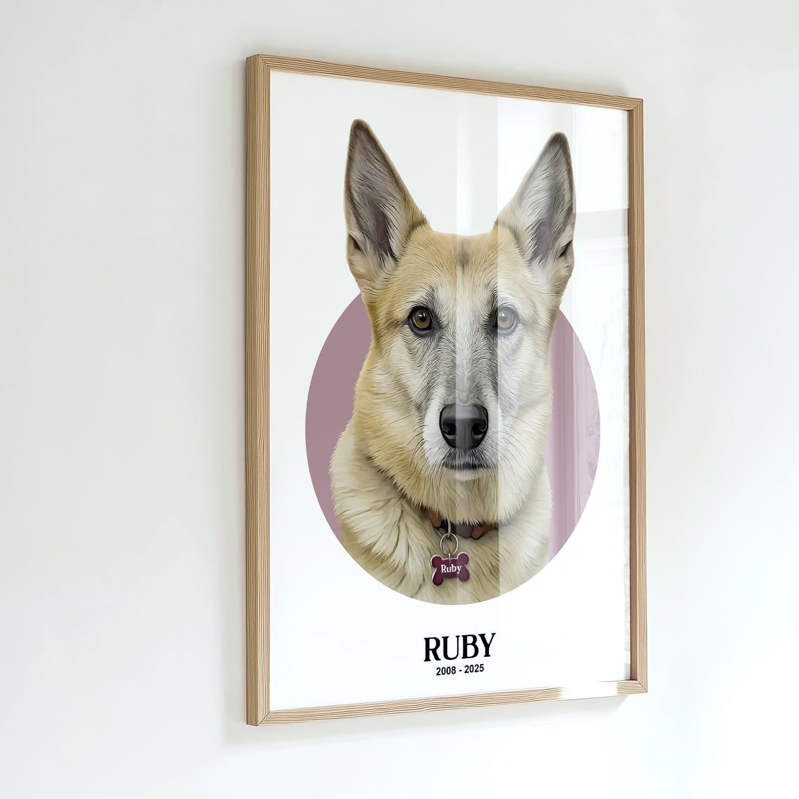 - A professionally printed and framed artwork of your pet, based on the photo/s you upload.