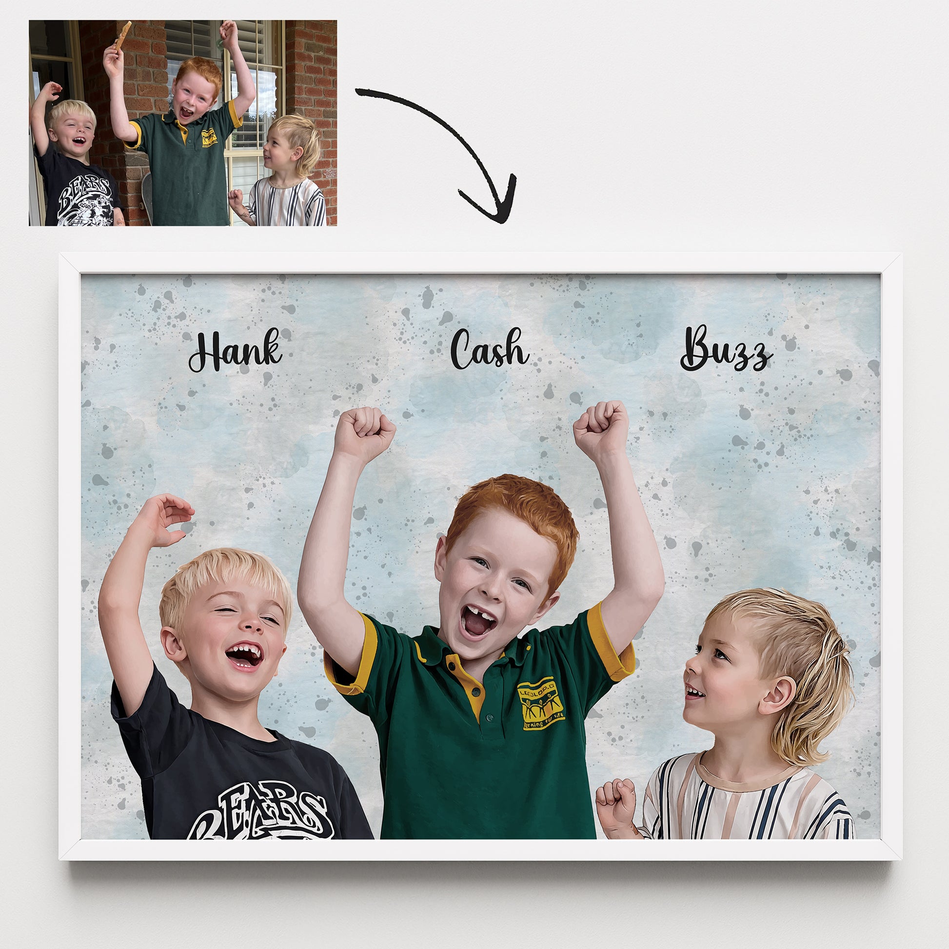 Our artists turn your photo(s) into a beautiful portrait done in our signature watercolour realistic style. Perfect as a heartfelt gift or a lasting tribute to your family member(s) or friend(s).