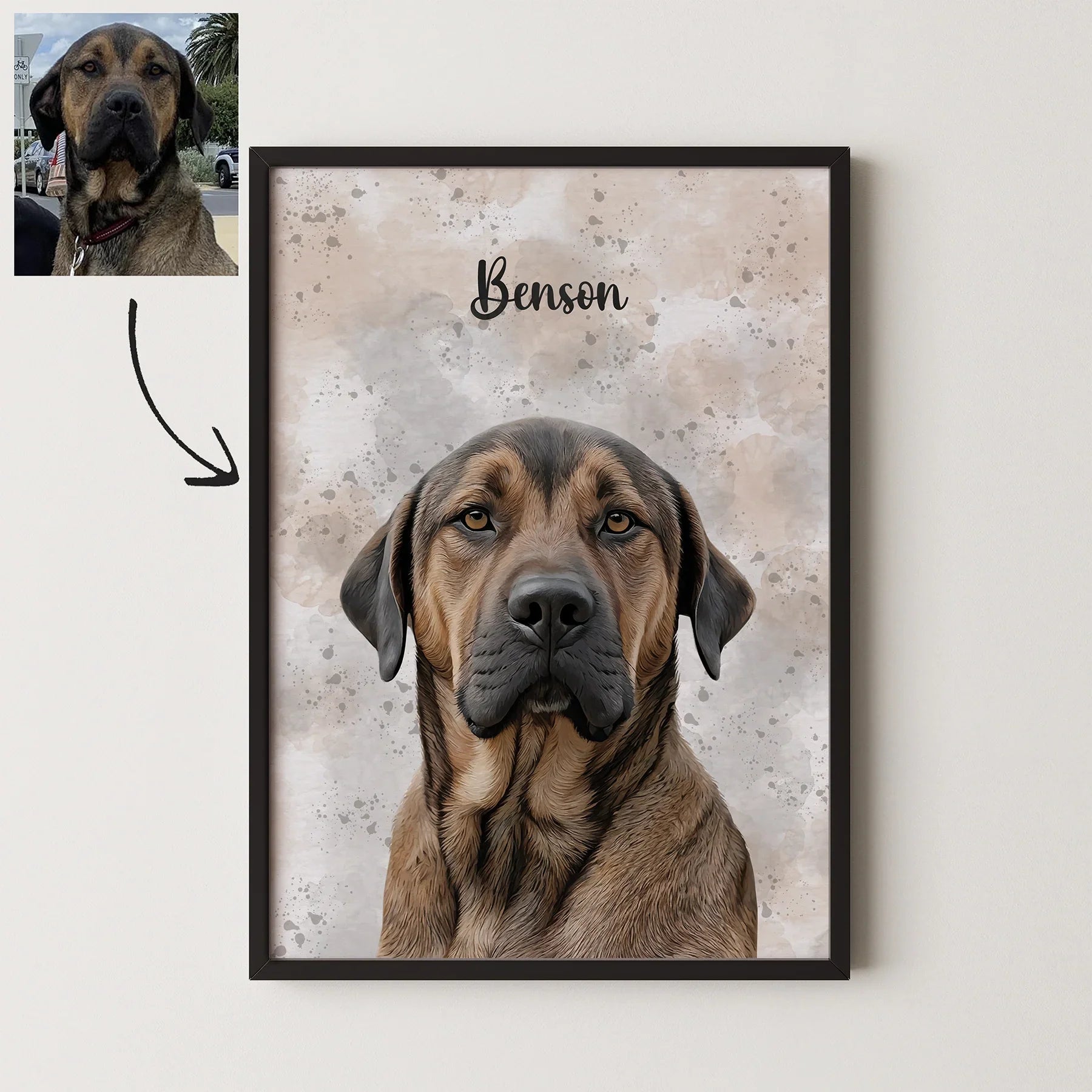 - A professionally printed and framed artwork of your pet, based on the photo/s you upload.